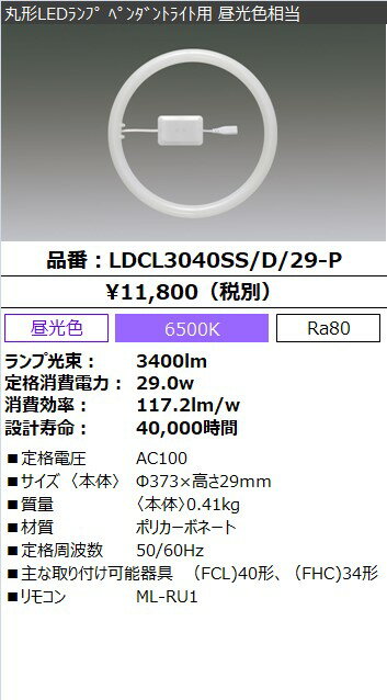 メーカー: IRIS OHYAMA / アイリスオーヤマ 丸形LEDランプ(LED蛍光灯)ペンダントライト専用 消費電力:29W (29ワット) 電圧:AC100V 調光:5段階 常夜灯機能付き 演色性:Ra80 定格周波数:50/60Hz 質量:約413g ■本製品は、一般のFCL、FHC 丸形蛍光灯照明器具に取り付けて使用するLED ランプです ■FHD(スリム二重環形蛍光灯)、FHG(スリム角形蛍光灯)器具には使用できません。