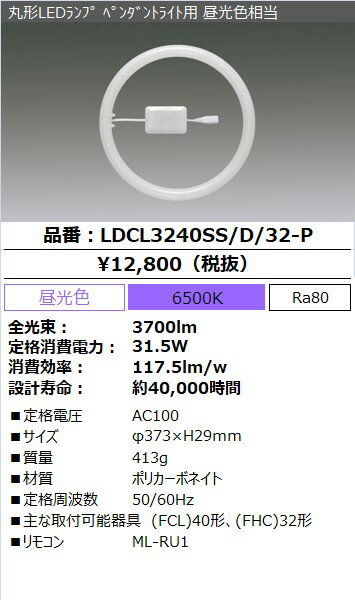 メーカー: IRIS OHYAMA / アイリスオーヤマ 丸形LEDランプ(LED蛍光灯)ペンダントライト専用 消費電力:31.5W (31.5ワット) 電圧:AC100V 調光:5段階 常夜灯機能付き 演色性:Ra80 定格周波数:50/60Hz 質量:約413g ■本製品は、一般のFCL、FHC 丸形蛍光灯照明器具に取り付けて使用するLED ランプです ■FHD(スリム二重環形蛍光灯)、FHG(スリム角形蛍光灯)器具には使用できません。