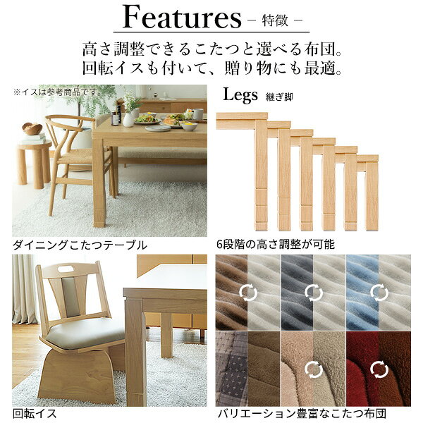 【セット構成】こたつ本体x1台/こたつ布団x1枚/回転椅子x4台 【布団バリエーション】しじら織り・レンガxブラウン・ベージュxグレー 【仕様】 ■こたつ本体 天板:繊維板(転写プリント) 脚部:天然木(ラバーウッド) 薄型石英管ヒーター(500W・中間スイッチ式) コード長さ:約3m ◎一部組立(脚部取付) ■こたつ布団 [しじら]表地:綿100% 裏地:アクリル100% 中綿:ポリエステル100% [レンガ・ベージュ]表地・裏地:ポリエステル100%(はっ水フランネル) 中綿:ポリエステル100% ■回転椅子 フレーム:天然木(アカシア) 座面:合成皮革 ◎一部組立(脚部取付) 【サイズ】 ■こたつ本体 幅135x奥行80x高さ45/50/55/60/65/70cm(継ぎ脚10cmx2個 5cmx1個)・約23kg ■こたつ布団 [しじら]295x240cm・中綿約1.35kg [レンガ・ベージュ]297x242cm・中綿約680g ■回転椅子 幅46.5x奥行49x高さ75(70)cm・約9kg 株式会社ナカムラ(I-3300258)こたつ単品 >90x60 >80x80 >105x80 >135x80 >150x90 こたつ+選べるこたつ布団セット >90x60 >80x80 >105x80 >135x80 >150x90 こたつ+選べるこたつ布団+回転椅子セット >90x60 >80x80 >105x80 >135x80 >150x90 こたつ+選べるこたつ布団+肘付き回転椅子セット >90x60 >80x80 >105x80 >135x80 >150x90 こたつ掛け布団単品(しじら織り) >90x60 >80x80 >105x80 >135x80 >150x90 こたつ掛け布団単品(はっ水リバーシブル) >90x60 >80x80 >105x80 >135x80 >150x90 肘のない回転椅子 >単品 肘付き回転椅子 >単品 >組立設置サービスのご購入 >引取り(解体)サービスのご購入